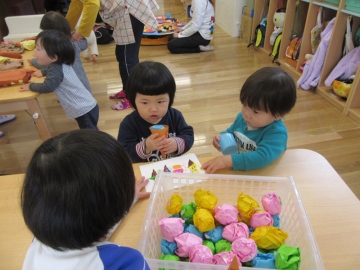 異年齢交流として1.2歳児が一緒にお店屋さんごっこをしました。