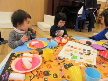 この後、いろいろな食材が並んでいる食べ物やさんとお家コーナーをそれぞれが好きなところへ行って楽しんでいました。