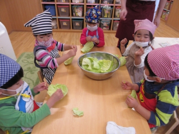 2歳児が今日の給食メニューの酢の物に入れるキャベツを手でちぎる作業をしました。