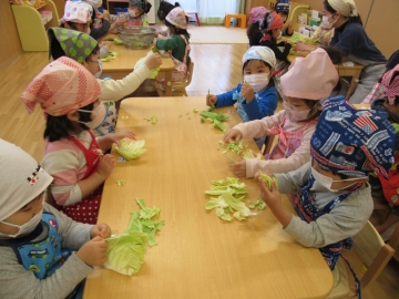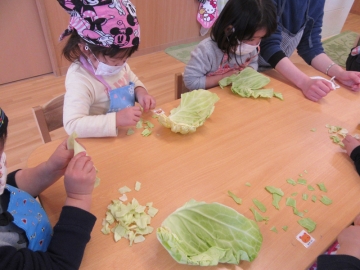実際目の前で大きなキャベツを見せてもらって「わ~大きい!」と驚いていた子ども達でした。自分の手で触ったり、においをかいで観たり・・・などしながら指先で一生懸命ちぎっていました。