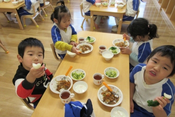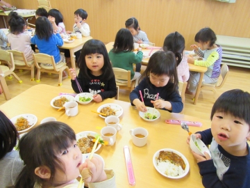 給食では、お箸を使っておいしそうに食べていました。