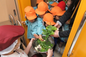 一人ひとつずつ嬉しそうに収穫し、給食の先生にゆでてもらった株を葉っぱも全部食べました。