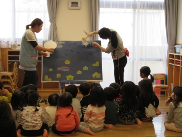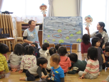 このほかに、♪ゆきのペンキ屋さん♪に合わせてペイント遊びをしました。誕生児の子どもたちがお手伝いして一緒にに楽しみました。