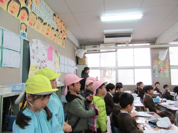図工・音楽などの授業風景を見たり学校の階段・廊下・運動場など見せていただきました。