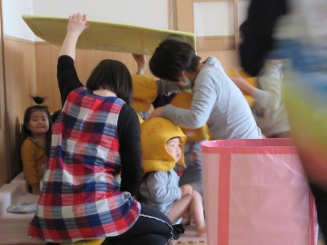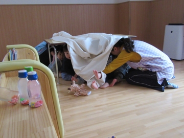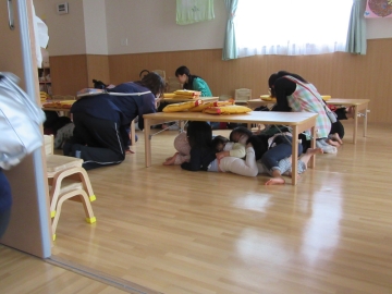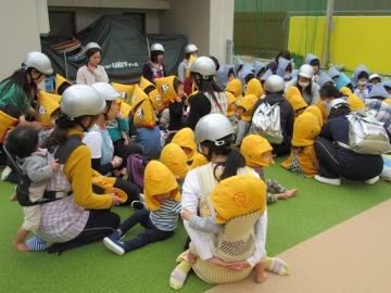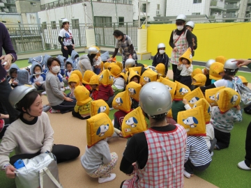 今日は、室内で一時避難をしてから4階へ避難しました。全員中階段から4階へヘルメット・頭巾をかぶって上手に避難ができていました。
