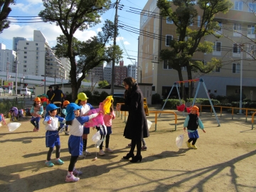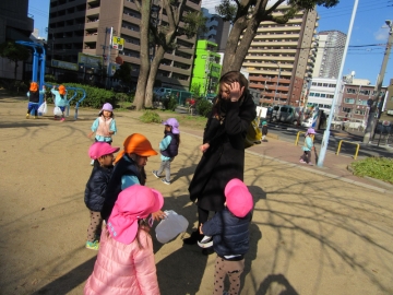 その後は公園で ”ハロー!!”と”ホップ・ステップ・ジャンプ”の英語の歌をみんなで身体を動かせて楽しみました。