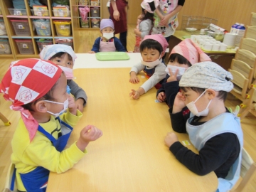 エプロン・三角巾・マスクをつけることも楽しみな子どもたち・・・