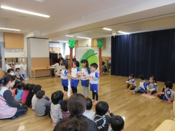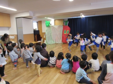 発表会で取り組んだ 劇あそびごっこ ”はらぺこあおむし” をうさぎ組みさんに見てもらいました。