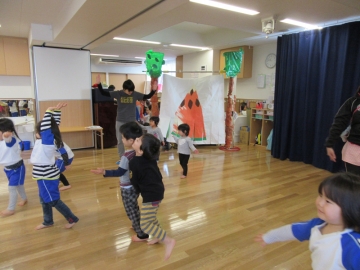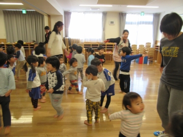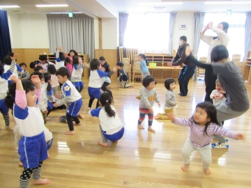 りす組みの子どもたちも参加して、踊りや歌を一緒にして3歳児さん同士の交流を楽しみました。