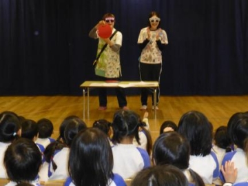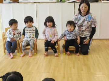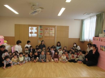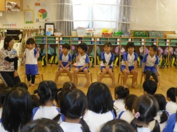 保育士からのお祝いとして、ペープサート「まんまるちゃん!」を見ました。