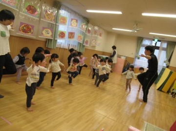 歩く・走る・ジャンプする・ウサギ・ペンギン・カエル・犬などの動きになって楽しんでいた子どもたちでした。