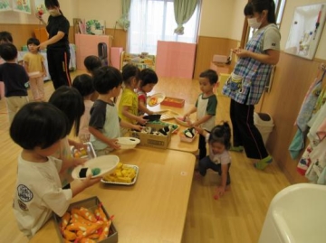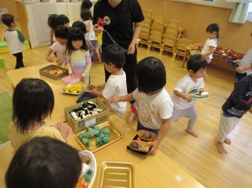 お弁当・たこ焼き・焼きそば・お好み焼きなどいろいろなお店に行ってごっこ遊びを一緒に楽しみました。