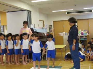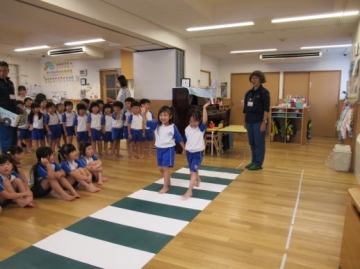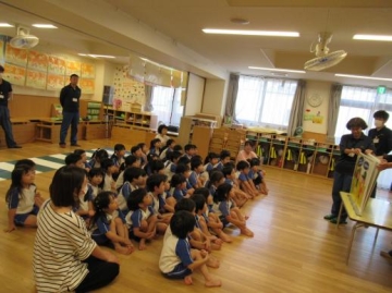 家を出るときは必ず行き先を知らせる・知らない人について行かない・知らない人がどんな人だったか等、紙芝居を通して教えて頂きました。知らない人について行かない5か条”いかのおすし”も教えて頂きました。