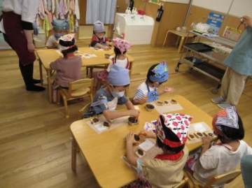 今日の3時のおやつ ”ココアトースト”を子ども達が自分で作りました。バターとココアと砂糖を混ぜてココアのペーストを作ったのを、食パンにスプーンでぬりました。給食の先生に教えてもらいながら、子どもたちは真剣な表情で一つひとつ丁寧にパンに塗っていました。