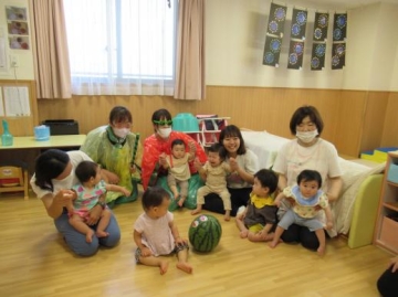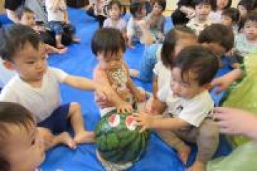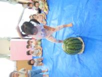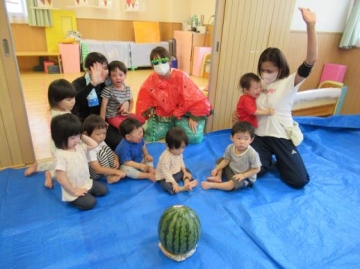 今日は、スイカのお姉さんが大玉すかを運んできてくれました。また、新町第3保育園の子どもたちも一緒に大きなすかをみんなで触らせてもらったり、りすぐみとあひるぐみは新聞紙でできた棒で叩いてみたり・・・と頑張ってスイカを割ろうとしていました。