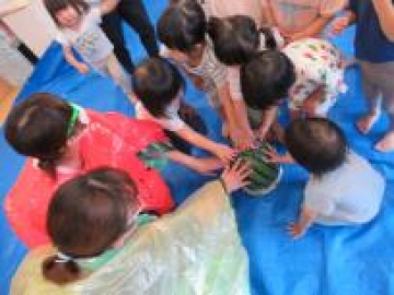 みどりいろのスイカを割ったら赤い実が見えてきて子ども達もびっくり‥大喜びしていました。
