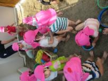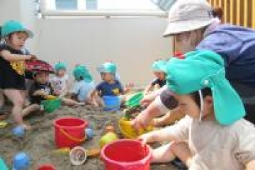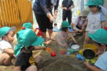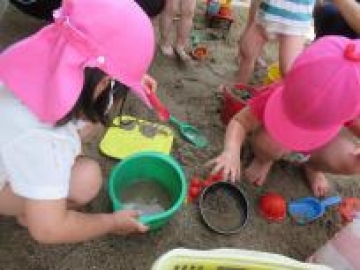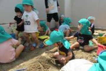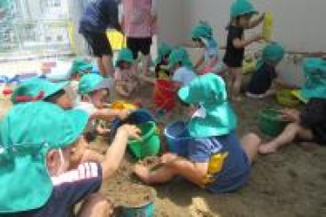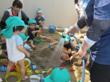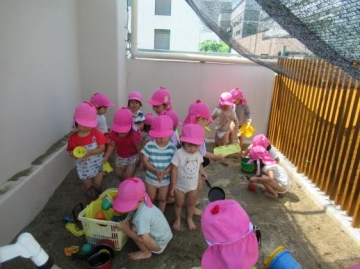 屋上の砂場でお水を入れて泥んこ遊びをしました。