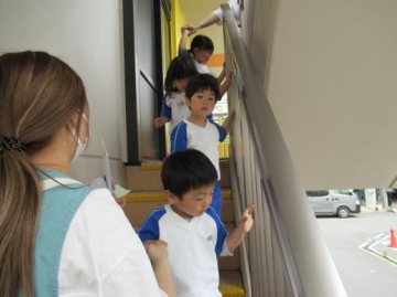 すみれ組は、外階段を使っての避難は初めてでしたが、手すりを持って上手に降りてきていました。