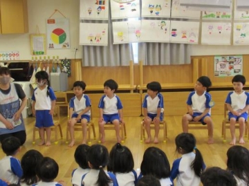 手遊びやペープサート”おつかいアリさん”を観たり、看護師さんの大型紙芝居 ”歯みがきしゅっしゅっしゅ‼”を観たりして楽しみました。 また、看護師さんからは6月4日は虫歯予防デーなので歯磨きをしっかりして歯を大切にしましょう~とお話をして戴きました。