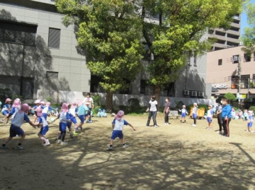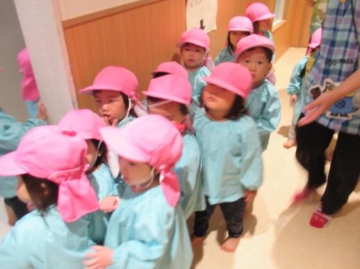 大きいクラスの子ども達は、今までしてきた訓練で覚えた ”火事の時は口を抑える”ことをしっかり守ってしていました。