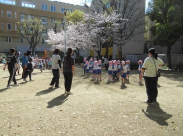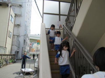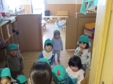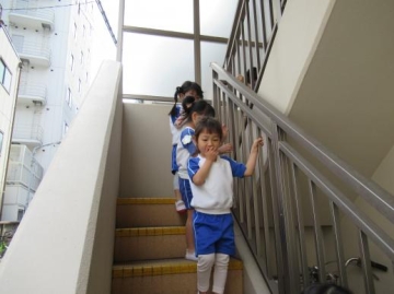 保育園周辺の工場が火災発生したことを想定して、4.5歳児は3階外階段より一階へ・・・1~3歳児は内階段から一階玄関へ・・