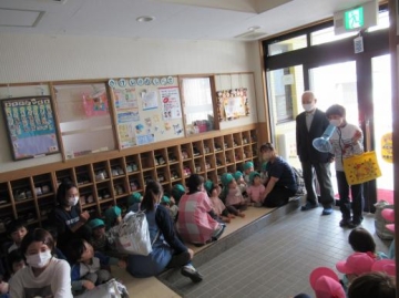 笛の音で一瞬驚いた子ども達もいましたが、玄関ホールへ降りてきたときは誰一人泣くことなく集中して訓練の話を聞いていました。
