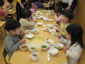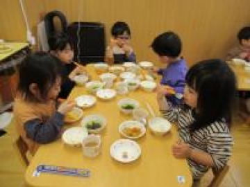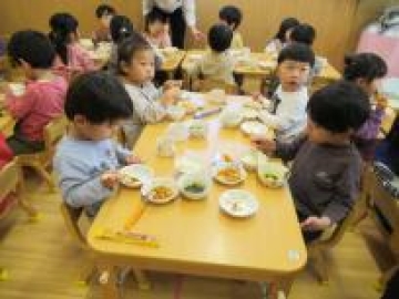 散歩から帰ってきてからは、第2保育園のあひる組の部屋で一緒に給食を食べました。
