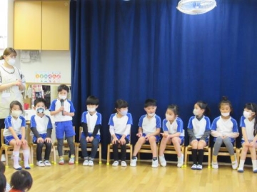 5歳児さんが入場し、自分の行く小学校名と大きくなったらなりたい職業を一人ずつ教えてもらいました。