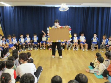 職員からは、ひまわり組さんが保育園で過ごした懐かしい品物の当てっこクイズをみんなで楽しみました。