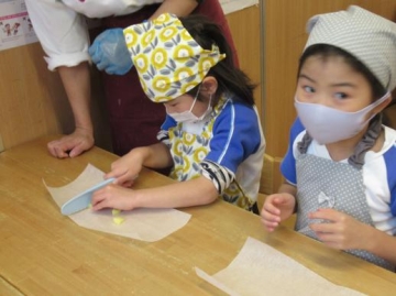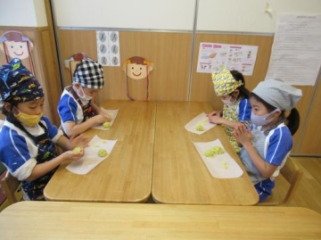 今回は初めて包丁を使って、リンゴを切ってみました。甘く煮てあるため軟らかくなっているので切りやすくなっています。薄いリンゴを半分ずつ4個にする作業でしたが、みんな真剣に左手は ”猫の手”を合言葉に頑張っていました。