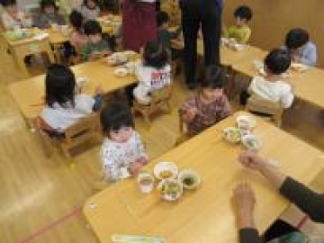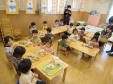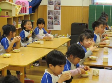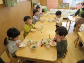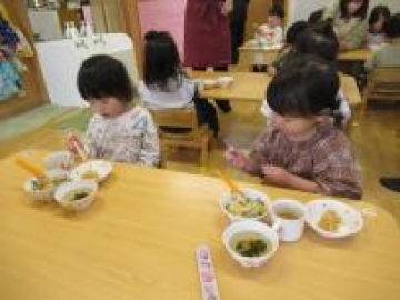 あひる組さんは、今日からすみれ組に進級するのにし”お箸”を使って給食を食べる練習をスタートしました。