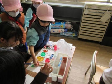 2グループに分かれて、1-4クラスは 昔遊び 1-5クラスは図工をけんがくし、昔遊びは一緒にお手玉や韓国のゲームをしたり、図工では、いろいろな素材を使って絵の具で模様を作る作業を一緒にさせて頂きました。