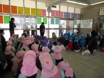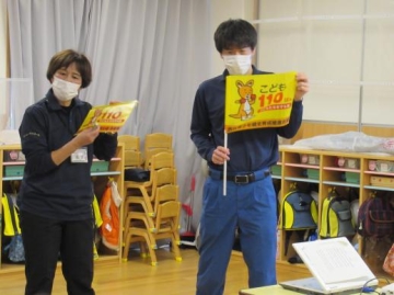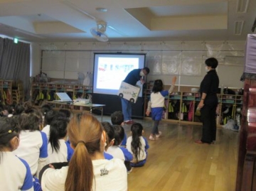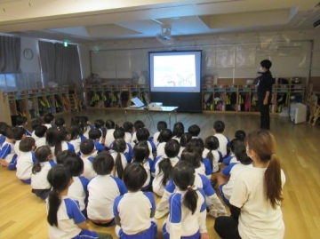 今日は西区防犯担当の方と西警察の方に来ていただき、5歳児が小学校へ行ってからの交通マナーや公園などでの危険な場所や遊び方などを教えて頂きました。