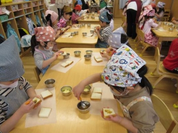 エプロンをつけて着席。給食の先生から作り方カレールーを食パンに塗り、上からちーずを振りかける作業を教えて頂きました。