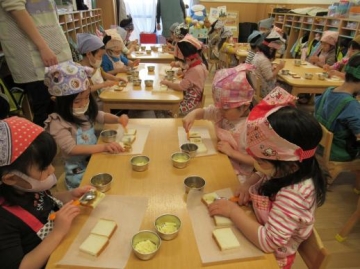 みんな食パンにカレールーをぬる作業を真剣に丁寧にしていた子ども達。チーズは一つひとつきれいに並べていました。