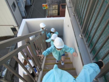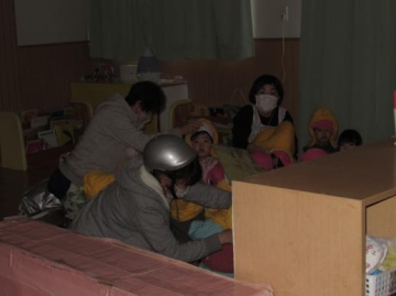 地震の後から、周辺の河が氾濫して津波がきた為屋上に避難しましたが、今日はとても寒かったので3階さくら組に集合しました。