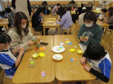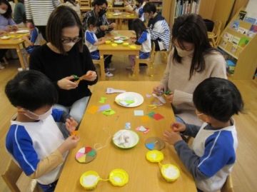 今日は4歳児クラスの保育参加があり、お家の方と一緒に”ぶんぶんゴマ”を作ったり、ふれあい遊びを楽しみました。