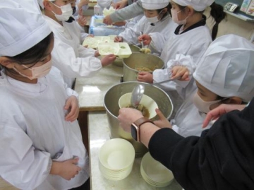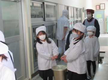 給食の準備では、当番の人が1階の給食室まで取りに行き、配膳をしているところ等一緒について行きみんな真剣に見ていました。