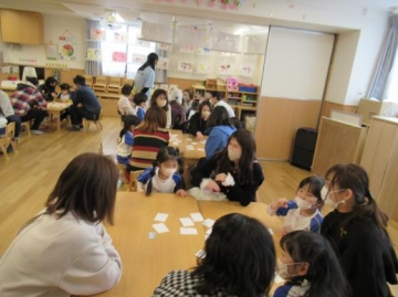 一つ目は、絵合わせゲームをするのに、画用紙をハサミで切る・色をぬる作業を親子で作り完成したらグループに分かれてみんなで絵合わせゲームを楽しみました。はじめのうちは、なかなか合わなくてやきもきしていましたがだんだん慣れてくると、上手に同じ絵を合わせることができていました。