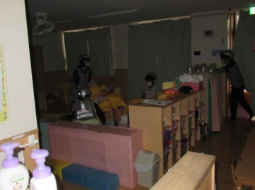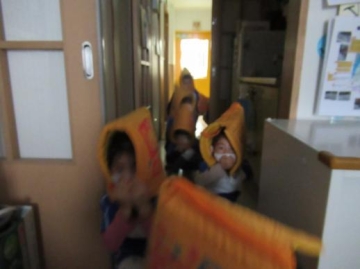 3.4.5歳児クラスは火事が起きた時、煙を吸わない避難の仕方を実体験もしました。