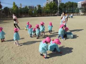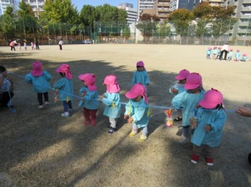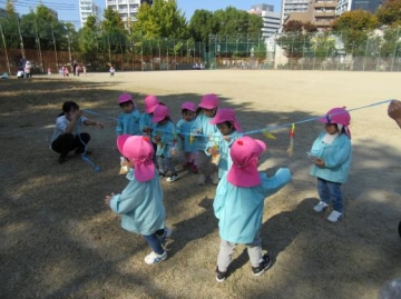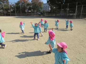 公園では、おやつ取りゲームや追いかけ玉入れ等 広い公園で身体をいっぱい動かして遊んできました。