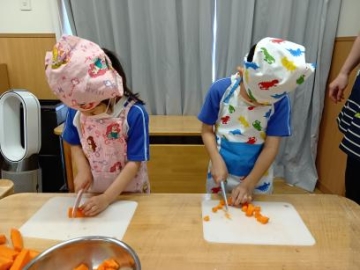 にんじんは、硬さもあってか、かなり力を入れて奮闘していた子どもたち・・両手使いで上手に切っていました。