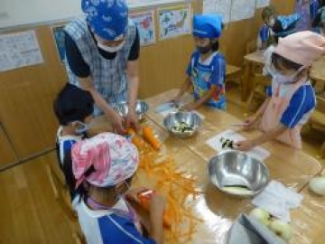 今日は、ひまわり組さんが食育活動で昼食メニューの”秋の野菜カレー”を作りました。