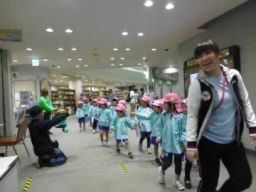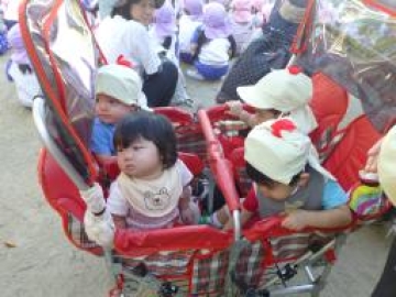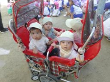 子どもたちは、公園へ避難するのは久しぶりで、0.1歳児クラスは避難者に乗って、2歳児クラスは友達と手をつないで行きました。