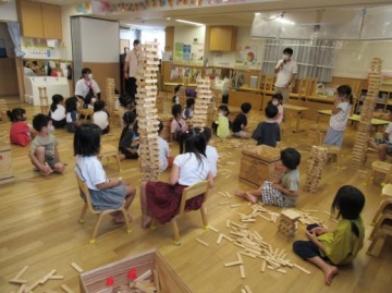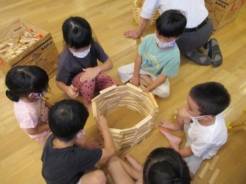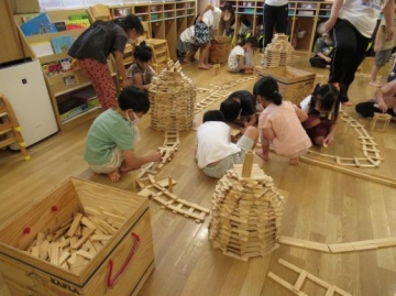 5歳児さんも新町保育園のパンダ組さんと一緒にカプラのワークショップに参加しました。