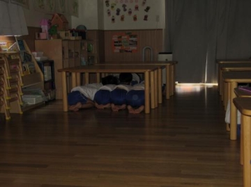 保育士の声掛けで机の下や、ロッカーの中に避難していました。