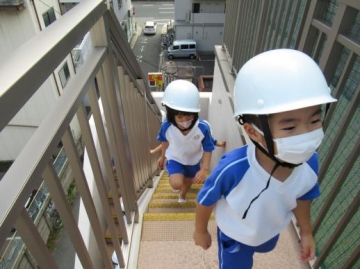 幼児は外階段から、乳児は内階段から屋上へ行きました。