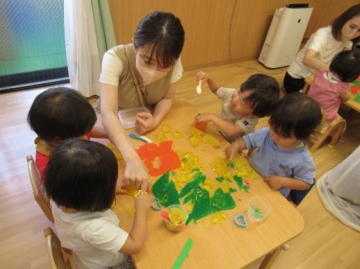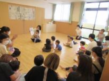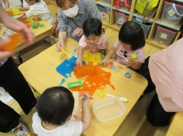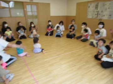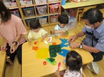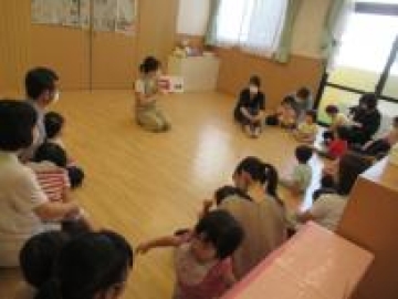 寒天が固まているその感触がはじめは触るのに眺めている子も多かったのですが、だんだん慣れてくると思いっきり触れるようになってお家の人と楽しんでいました。また、今日もお母さんに絵本を読んでもらって真剣に聞いていた子ども達でした。