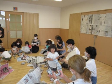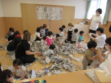 今日は、その1グループで保護者の方と一緒に新聞紙を使って遊びました。ビリビリ破ったり、クルクルまきつけたり、丸めたり・・・等いろいろな遊び方をして親子一緒に楽しみました。保護者が来ていない子ども達も泣くこともなく一緒に楽しんでいました。
