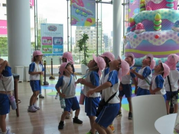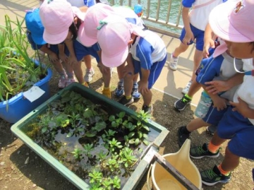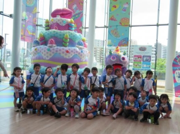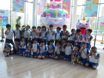 川の横には、いろいろな実のなる木ができていたり・・・柑橘系の木にはアゲハチョウが幼虫からかえって木の周りを飛び回っているのを見たり・・・池では水草の中をメダカや金魚が泳いでいるのをみたり・・・遊覧船が通っていたので、を手をふったり・・そして、すぐ近くにある大阪ガスのビルに入って遊んできました。室内で休息もでき子ども達も大喜びで遊んでいました。